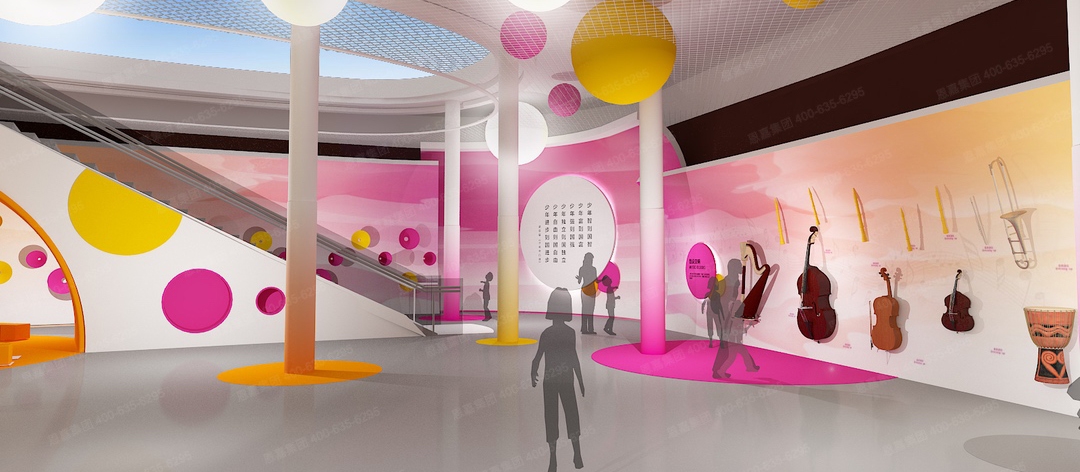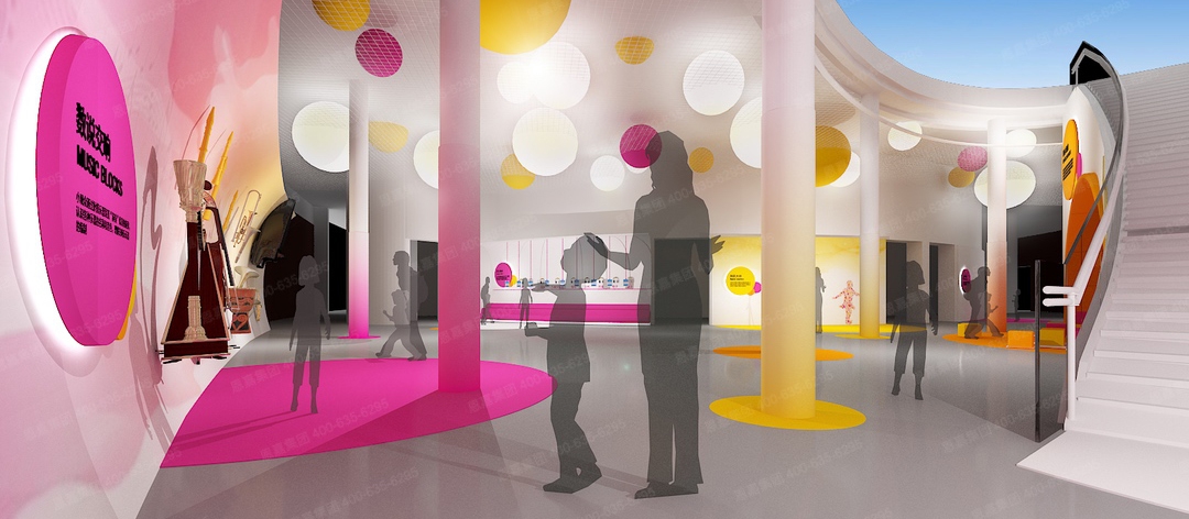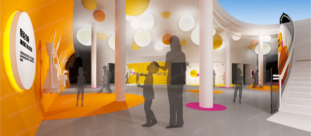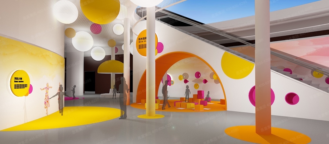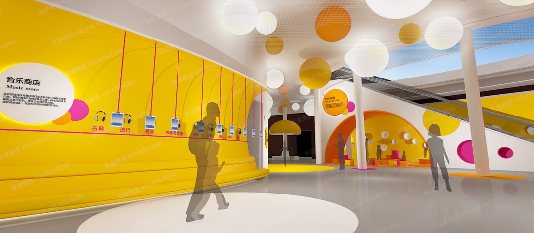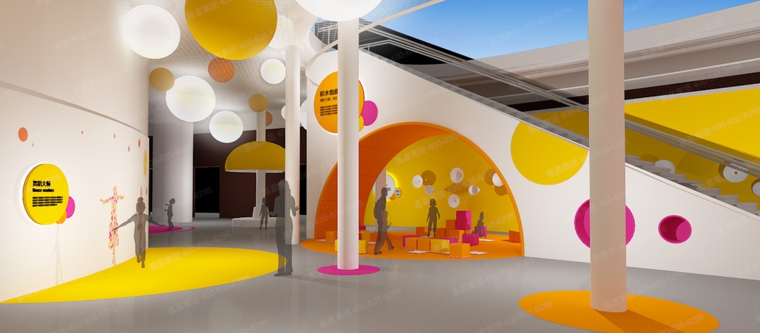 展厅色调选用色彩鲜明的黄色、粉色等,突出活泼跳动的展厅氛围;展厅装饰采用软性流线材质,充分考虑儿童安全和体验的舒适度;展厅的交互项目全部采用可看、可听、可触摸的通感模式,让儿童通过多重感官,体验展项带来的乐趣。