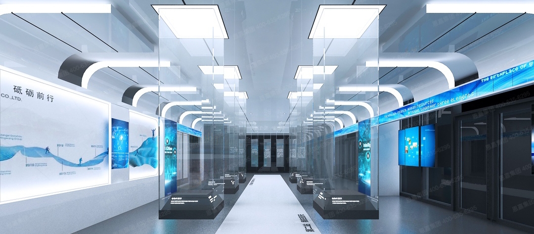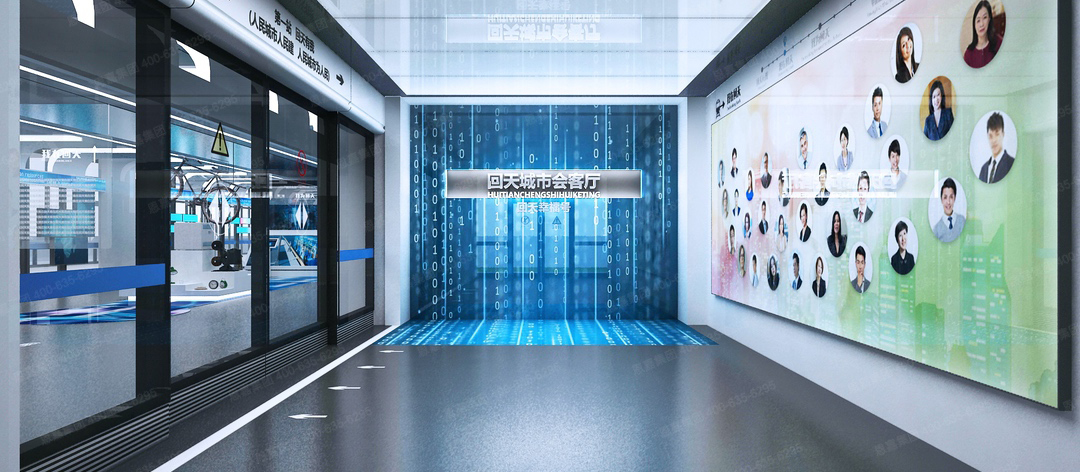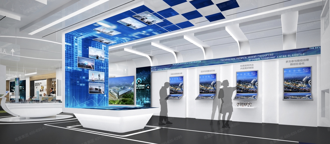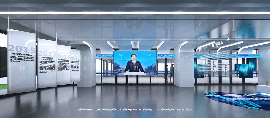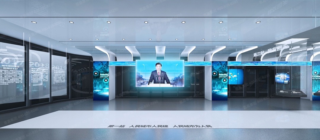 本展厅充分利用建筑本体,应用亚光白与科技蓝的对比、用光带配合,打造出富有科技感的城市文化客厅,LED屏、多媒体搭配沙盘、互动技术组合成智慧城市的展示雏形。通过白色衬底平和地过度到以绿色、原木色为主的休息、阅读区,展现出昌平区生态建设与可持续发展并重的理念,将持续为居民打造更生态、更智慧、更生活的城市居住体验。