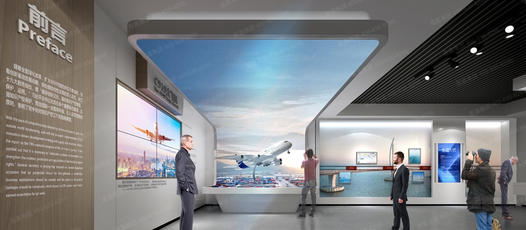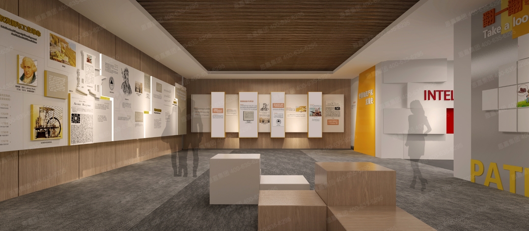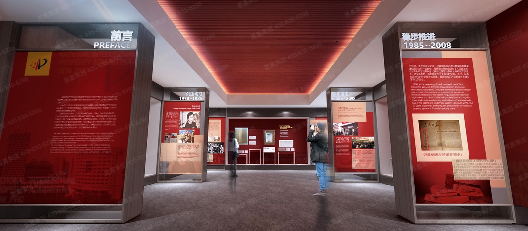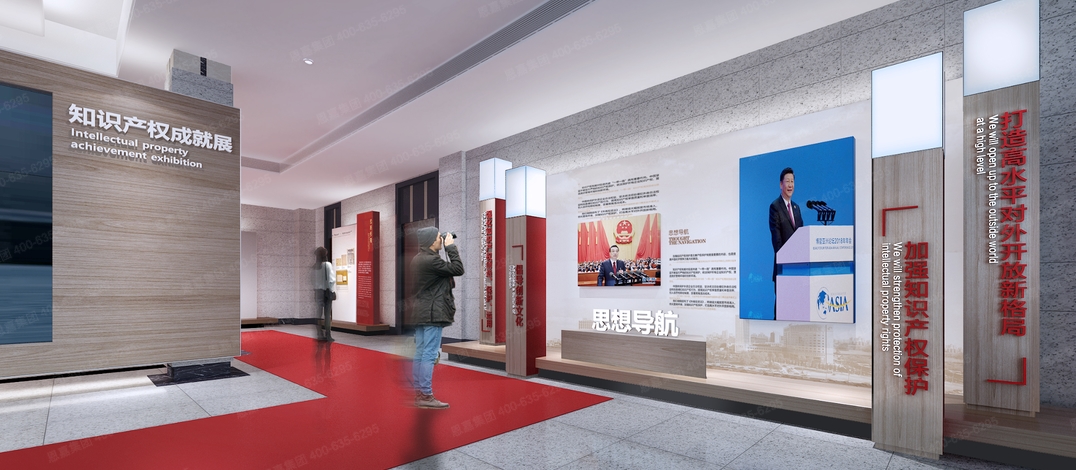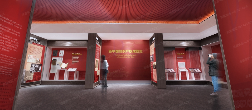 展示内容以新中国知识产权历史与成就、知识产权成果、知识产权奖、知识产权文化为展示内容,整体色彩以积淀白色为主基调,展示内容分割及重点展示内容以创新红设计,凸显知识产权“强国”底色与创新活力。