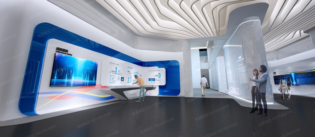 展厅用10条装饰曲线代表东盟十国,凝结成展厅内的展线,引领观众探寻中国与东盟各国间先进适用技术转移转化。以“方▪圆”造型在空间中相映成趣,赋予展厅韵律感和灵动感。
