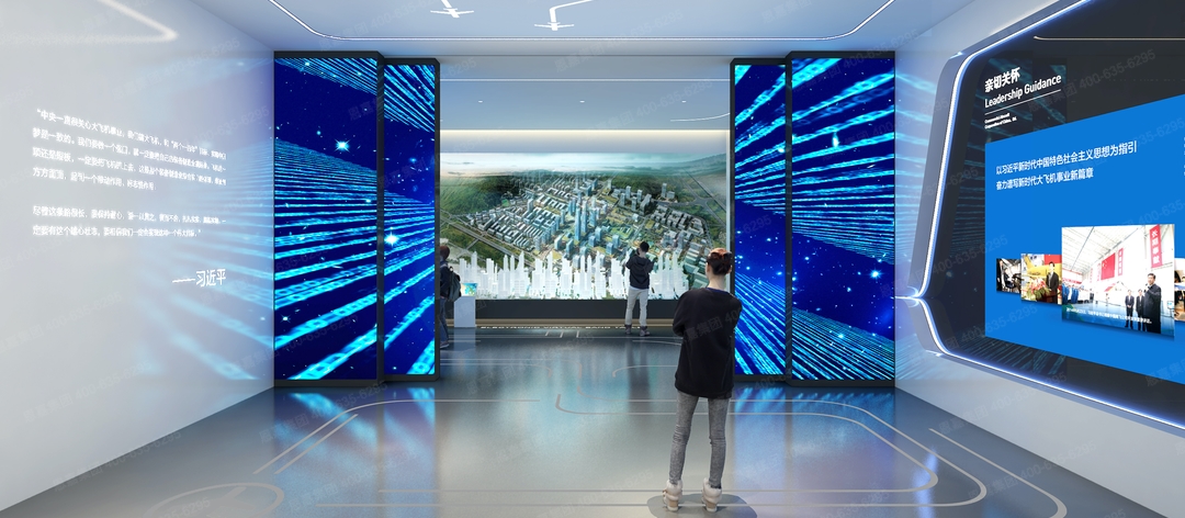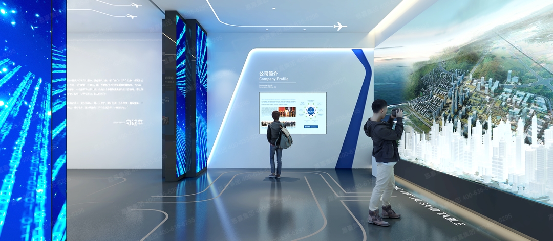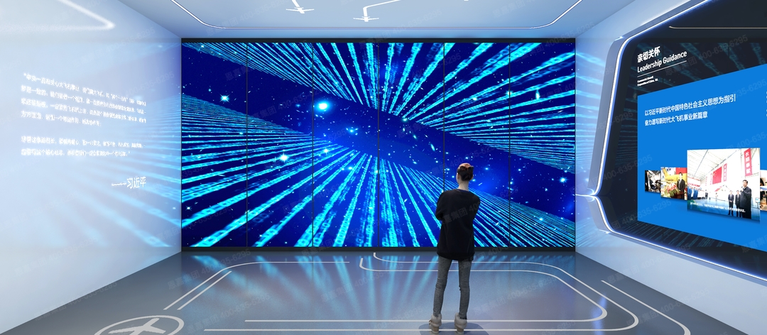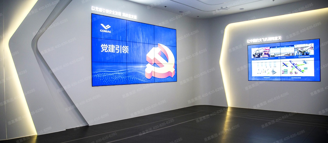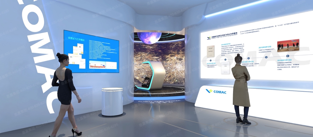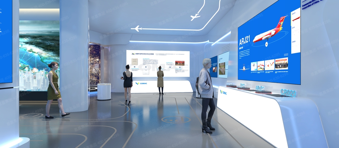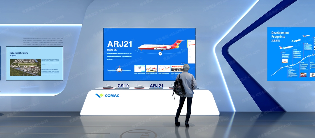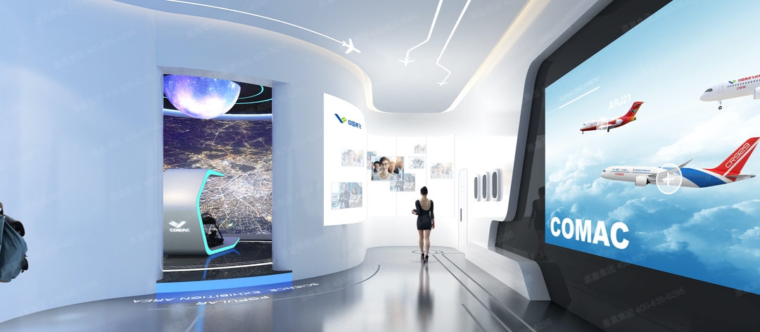 恩嘉设计是专业的企业展厅设计施工一体化服务公司。由恩嘉设计完成展厅施工及多媒体交互设计的“大飞机在东营”主题展厅全面彰显中国商飞“开拓创新·翱翔蓝天”的气魄。