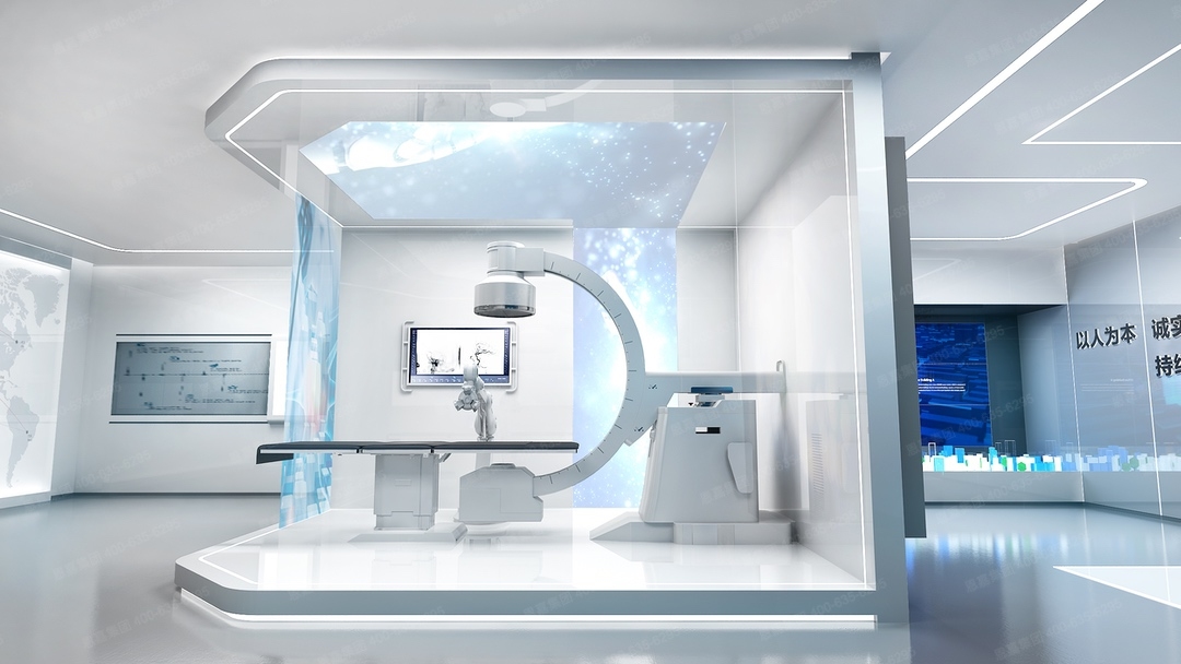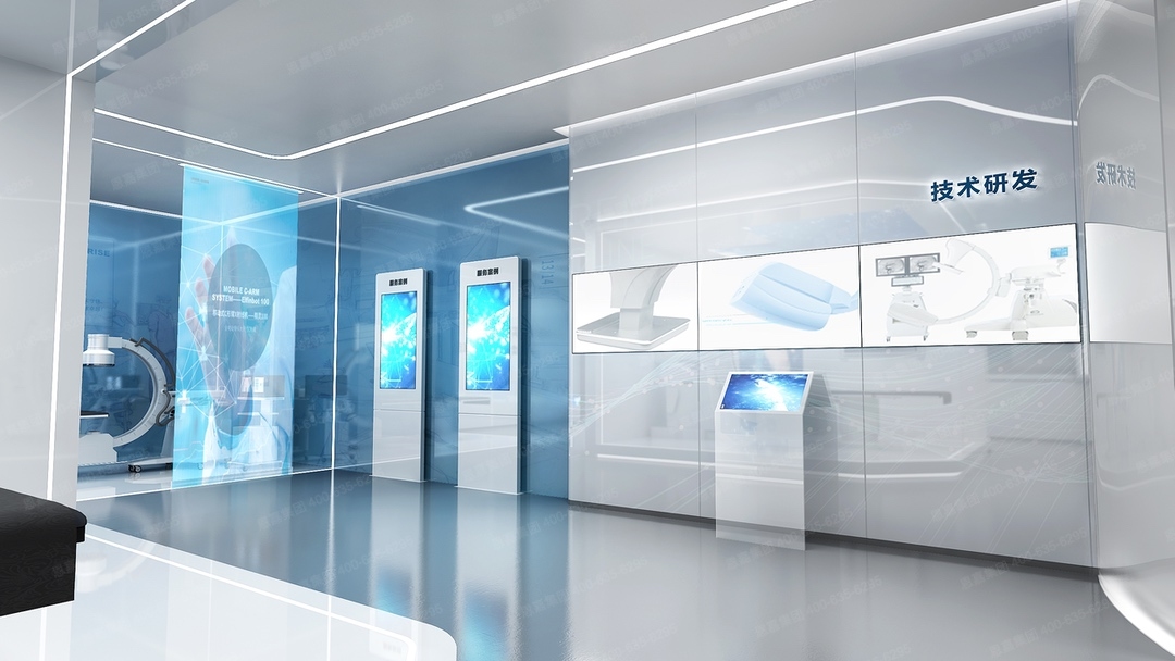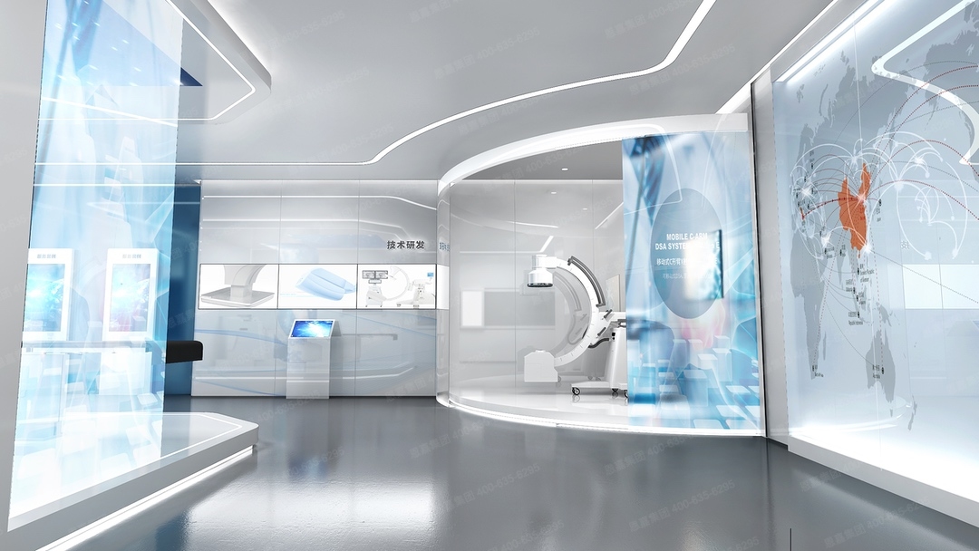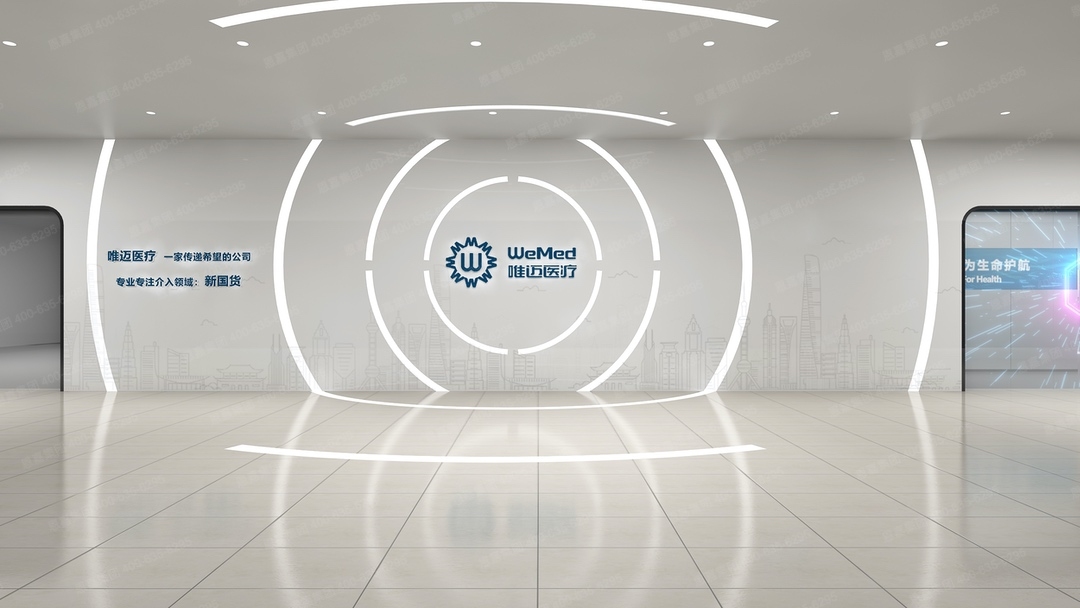 唯迈医疗肩负国家民族高端医疗品牌崛起的责任,是国家工信部认定的专精特新“小巨人”企业。展厅以“为生命护航”为理念,重点展示“C型手臂手术机器人”在医疗领域的应用与前景。
