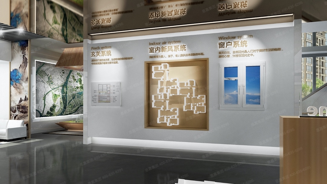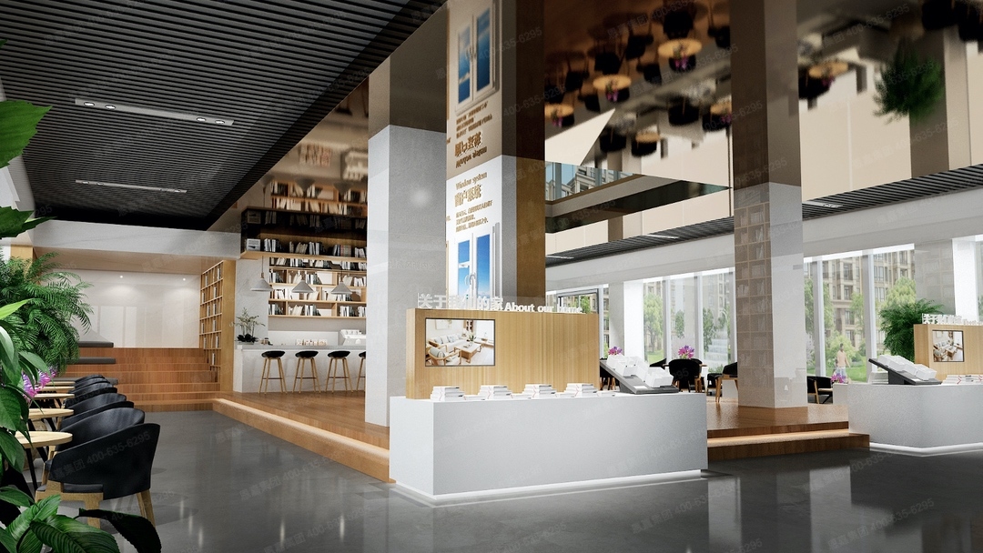 北京新机场生活基地展厅将展示融入到充满生活气息的场景中,“生活样板”“展示分享”“咖啡办公”功能板块的有机融合,沿袭住宅立面新中式风格,运用新中式对称美学,结合实际使用需求,对空间进行分割,中轴线贯穿主功能区域,其他功能区平均分布中轴线两侧,增加空间内对称的仪式感。